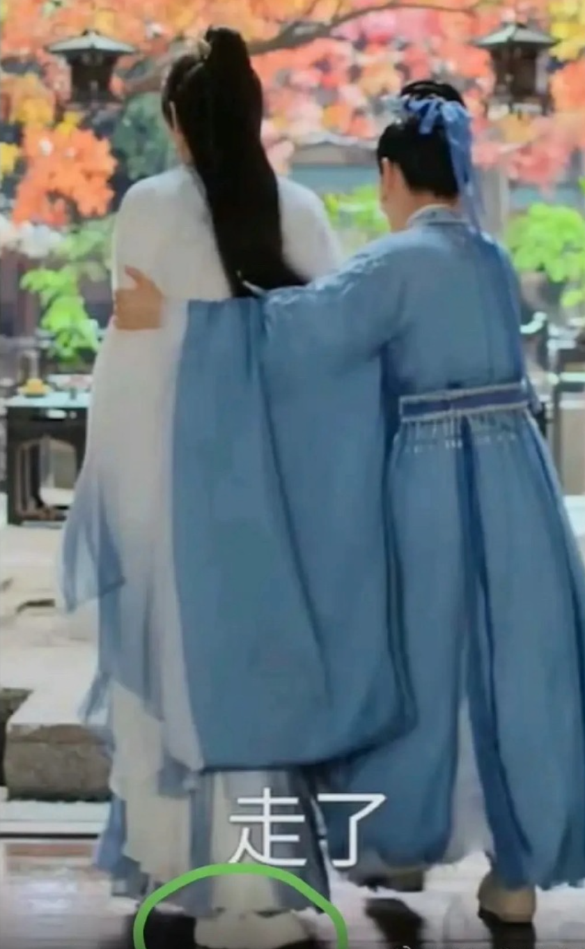 而另一个镜头,能明显看到成毅脚上穿的是鞋底很高的洞洞鞋,而非角色应该穿的长筒布靴。