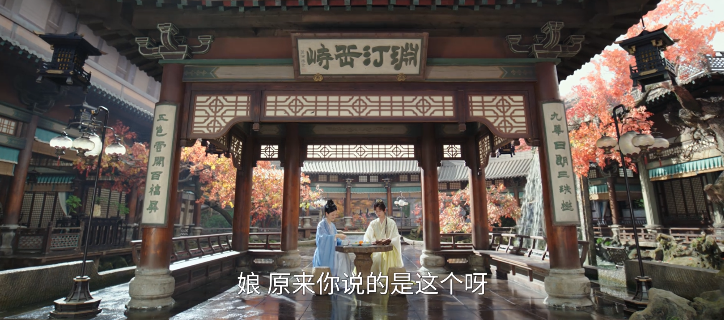 第二点,看到这个镜头我都气笑了。《赴山海》是穿越剧,穿越回了古代。母子俩在凉亭里谈心,应该就是随便在影视城里找了个景,加了点绿幕,只能说剧组从上到下都没文化,特别是外联制片和美术,都没发现问题。“九华日朗三珠树 五色云开百福屏”这幅对子出自曾国藩啊!难不成这部剧穿越回去的是晚清?